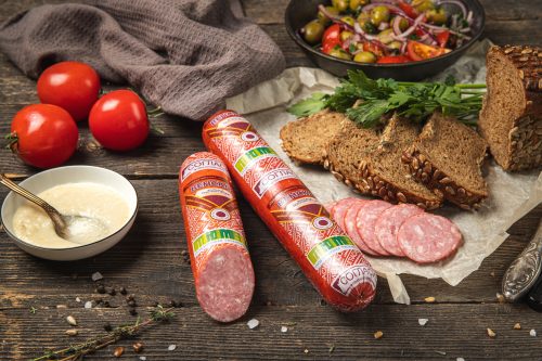 Состав: свинина, вода питьевая, нитритно-посолочная смесь (соль пищевая, агент антислеживающий (Е536), фиксатор окраски (Е250)), стабилизатор (Е450), пряности, сахар, усилитель вкуса и аромата (Е621), антиокислители (Е316,Е300), натуральный краситель (Е120).