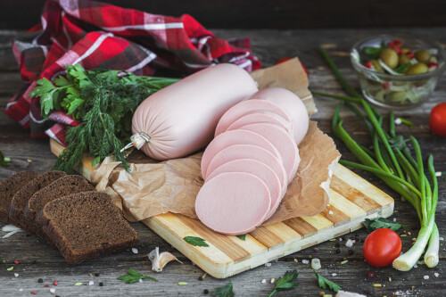Состав: Свинина, говядина, вода, меланж яичный, молоко сухое, соль пищевая, сахар, пряности (орех мускатный), антиокислитель: аскорбиновая кислота, фиксатор окраски: нитрит натрия.