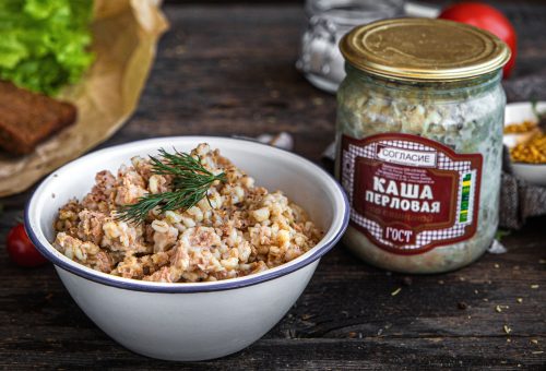 Состав: свинина, крупа перловая, вода, жир, лук репчатый, соль поваренная, перец черный.
